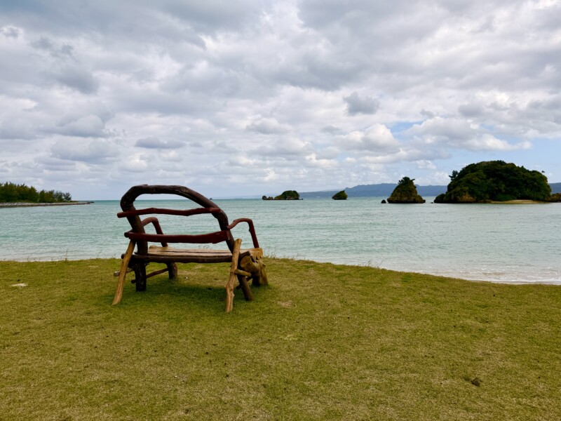屋我地ビーチでは、漂流してきた流木を再利用しベンチに作り変えるなど